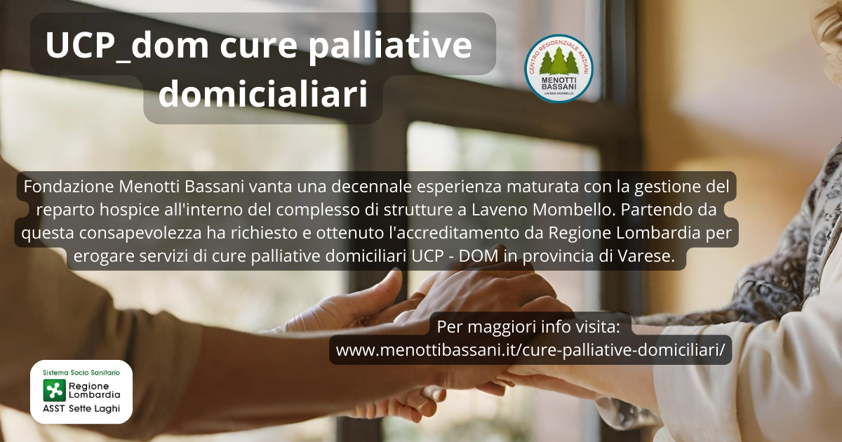 Forte della decennale esperienza maturata con la gestione del reparto hospice, Fondazione menotti Bassani ha richiesto e ottenuto l’accreditamento da Regione Lombardia per erogare servizi di cure palliative domiciliari UCP – DOM in provincia di Varese. Con questa scelta si vuole ulteriormente potenziare una serie di servizi già offerti (rsa aperta – mini alloggi protetti – alloggi sociali) in risposta alle esigenze del territorio che richiedono sempre più alti livelli di professionalità e specializzazione.